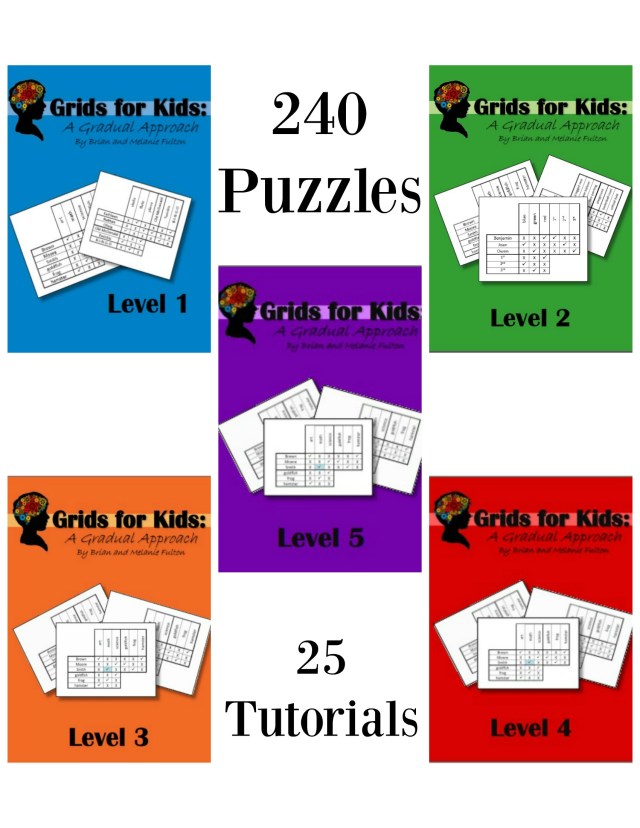 We have written a series of logic books designed to teach children how to solve Logic Grid puzzles. The goal is to train and develop the logical machinery of the mind, which is so necessary for later success in the mathematical sciences. The “Grids for Kids” series consists of five Level Books, and three Supplement Books. The Level Books each contain puzzles, solutions, and training tutorials. The Supplement Books only contain puzzles and solutions. The books progress in order of difficulty, with Level One being the easiest level. One side benefit from this series that we’ve seen in our own children, is a greater attention to detail in the precise use of language.